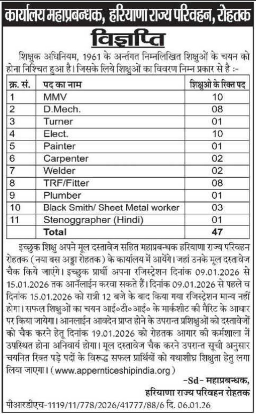 Haryana Roadways Rohtak Apprentice Recruitment 2026: हरियाणा रोडवेज रोहतक डिपो ने आईटीआई पास उम्मीदवारों के लिए अप्रेंटिस के 47 पदों पर भर्ती का नोटिफिकेशन जारी कर दिया है। यह भर्ती केवल हरियाणा निवासी उम्मीदवारों के लिए है। यदि आपने आईटीआई पास कर रखी है और सरकारी विभाग में ट्रेनिंग करने का मौका ढूंढ रहे हैं, तो यह आपके लिए सुनहरा अवसर हो सकता है। इच्छुक उम्मीदवार 09 जनवरी 2026 से 15 जनवरी 2026 तक ऑनलाइन आवेदन कर सकते हैं।